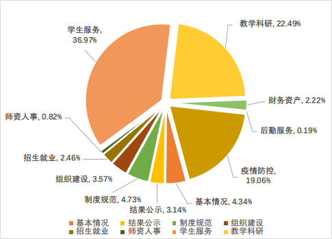 本学年度,学院主动公开信息约2072条。在主动公开的信息中,包括sjb世俱杯、学院领导、内部管理体制等基本情况类信息90条,占主动公开信息的比例为4.34%;会议纪要、干部任命、师生获奖奖项评定等结果公示类信息65条,占主动公开信息的比例为3.14%;各类办法、规定等制度规范类信息98条,占主动公开信息的比例为4.73%;党建方案、支部换届、党员发展等组织建设类信息74条,占主动公开信息的比例为3.57%;本研招生、学生就业类信息51条,占主动公开信息的比例为2.46%;团学活动、图书资源使用等学生服务类信息766条,占主动公开信息的比例为36.97%;师资队伍建设和人事任免类信息17条,占主动公开信息的比例为0.82%;各类教学活动安排,以及科研课题、评奖等教学科研类信息466条,占主动公开信息的比例为22.49%;财务制度、收费标准和资产管理等各类财务资产类信息46条,占主动公开信息的比例为2.22%;基建维修、招标采购等后勤服务类信息4条,占主动公开信息的比例为0.19%;新冠肺炎疫情防控数据、院疫情防控工作专报等疫情防控类信息395条,占主动公开信息的比例为19.06%。