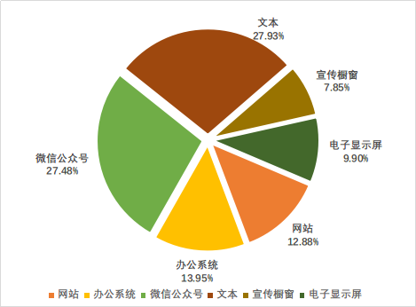 在主动公开的信息中,通过校园网及院外有关机构及部门网站(中直采购网、国家研招网等)方式进行公开的信息315条,占主动公开信息的比例为12.88%;通过院内办公系统方式公开的信息341条,占主动公开信息的比例为13.95%;通过文本方式公开的信息683条,占主动公开信息的比例为27.93%;通过宣传橱窗公开的信息192条,占主动公开信息的比例为7.85%;通过电子显示屏公开的信息242条,占主动公开信息的比例为9.90%;通过微信公众号公开的信息672条,占主动公开信息的比例为27.48%。