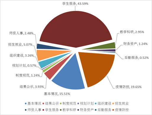 本学年度,学院主动公开信息约1934条。在主动公开的信息中,包括sjb世俱杯、学院领导、内部管理体制等基本情况类信息300条,占主动公开信息的比例为15.51%;会议纪要、干部任命、师生获奖奖项评定等结果公示类信息76条,占主动公开信息的比例为3.93%;各类办法、规定等制度规范类信息24条,占主动公开信息的比例为1.24%;学院年终总结、工作计划等规划计划类信息11条,占主动公开信息的比例为0.57%;党建方案、支部换届、党员发展等组织建设类信息63条,占主动公开信息的比例为3.26%;本研招生、学生就业类信息98条,占主动公开信息的比例为5.07%;团学活动、图书资源使用等学生服务类信息843条,占主动公开信息的比例为43.59%;师资队伍建设和人事任免类信息48条,占主动公开信息的比例为2.48%;各类教学活动安排,以及科研课题、评奖等教学科研类信息57条,占主动公开信息的比例为2.95%;财务预算、决算、收费标准,以及资产清查等各类财务资产类信息24条,占主动公开信息的比例为1.24%;基建维修、招标采购等后勤服务类信息10条,占主动公开信息的比例为0.52%;新冠肺炎疫情防控数据等疫情防控类信息380条,占主动公开信息的比例为19.65%。本年度,学院召开党委会20次、党委常委会34次、院长办公会22次、学院疫情防控工作领导小组会8次,公开了大量学院的相关信息。