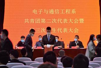 2020年10月16日晚6时30分,电子与通信工程系2020年学生代表大会在学术报告厅召开。系党总支书记马老师、院团委刘老师、系团总支书记方老师、系学生辅导员徐老师、系团总支左老师受邀出席了本次会议。