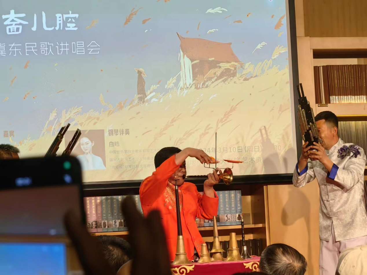 本次讲座由中国音乐学院博士生导师张天彤教授主讲,河北省级非遗项目“冀东民”省级代表性传承人89岁高龄的刘荣德先生应邀一同讲述冀东民歌的内涵、题材体裁采集挖掘背后的故事,唐山市古韵新声艺术团现场表演展示冀东民歌的风采。
