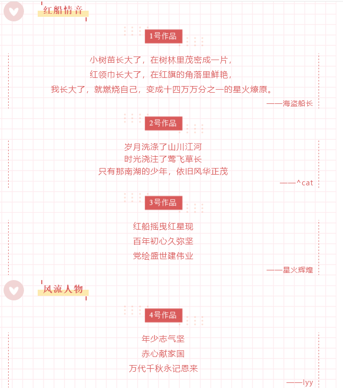 我系主办的“初心不忘 尺素迢传”三行情诗初赛顺利开展。听红船情音,看风流人物,品专业浪漫,会言浅情深,赏人间邂逅。五大专题,五种故事。同学们积极参与,用耐人寻味的诗作让我们大饱眼福。最终,我们将结合线上评选和线下评选的结果进行综合评分,让我们期待最终结果吧~