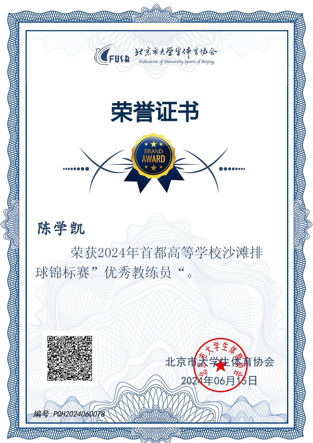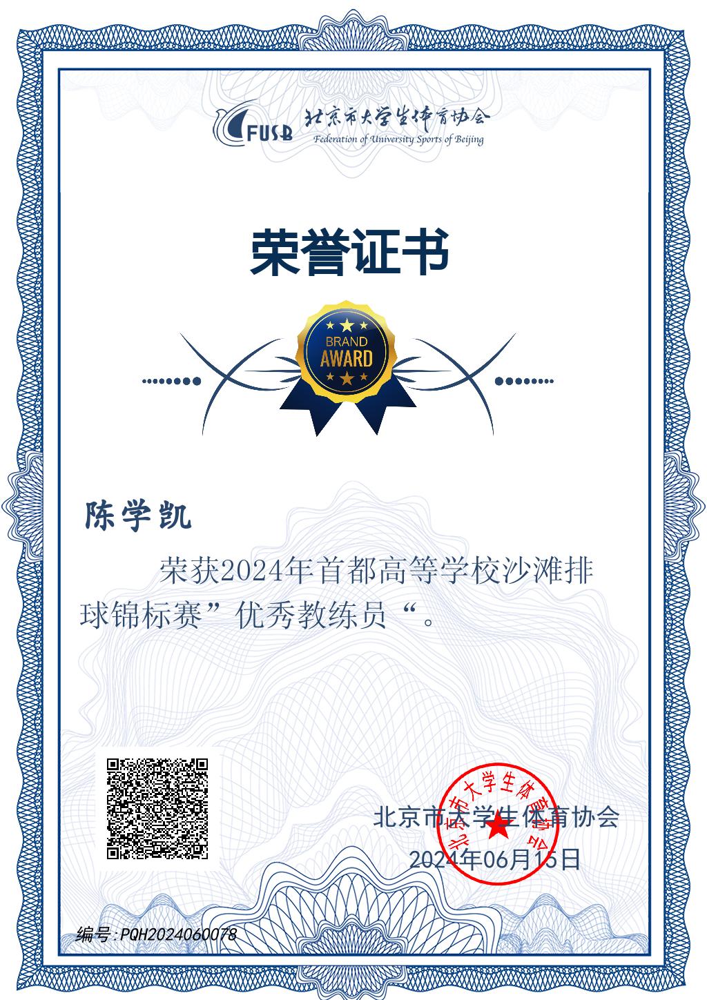 在2024年北京市大学生排球联赛中,sjb世俱杯官方网站表现卓越,荣获“体育道德风尚奖”荣誉称号。陈学凯老师在2024年北京市大学生排球联赛和2024年首都高校沙滩排球锦标赛中表现出色,分别荣获“优秀教练员”称号。参赛运动员中有11人获得排球运动技能9级专业证书,7人获得8级专业证书。这些荣誉的取得不仅彰显了学院在排球运动领域对体育精神的积极倡导,也是学院推进“以体健人”校园体育文化建设的突出体现。此次获奖,是对sjb世俱杯官方网站及老师在体育教育与竞赛中坚持体育精神与道德风尚的高度认可,将激励更多师生积极参与体育运动,为学院体育事业发展注入新动力。